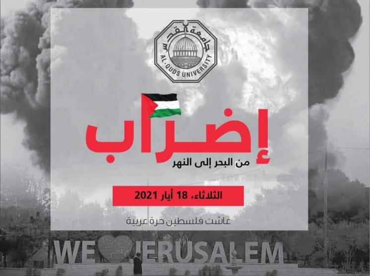 أعلن المكتب الحركي في جامعة القدس، عن الإضراب الشامل يوم غد الثلاثاء الموافق 18-5-2021 في كافة فروع ومراكز الجامعة.