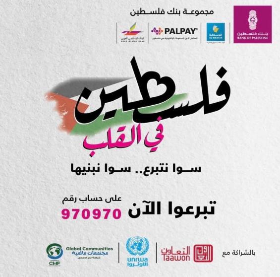 أعلن السيد هاشم الشوا رئيس مجلس إدارة مجموعة بنك فلسطين المالية عن اطلاق حملة كبيرة تحت عنوان "فلسطين في القلب.. سوا نتبرع، سوا نبنيها"، وذلك لحشد الدعم والتبرعات لإغاثة أهلنا المتضررين جراء العدوان الأخير على فلسطين. مشيراً الى أن المجموعة ستسخر كامل إمكانياتها وعلاقاتها ونوافذها الإعلامية والإعلانية، ومنصاتها الإلكترونية والمصرفية لاستقبال تبرعات المواطنين والعملاء والمغتربين.