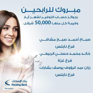 أعلن بنك الإسكان في فلسطين عن نتائج السحب على " الجوائز الشهرية " لجوائز حسابات التوفير لشهر أيار 2021 الحالي، والتي تبلغ قيمتها 150,000 شيكل موزعة على ثلاثة فائزين بواقع 50,000 شيقل لكل فائز، حيث فاز بجوائز الشهر كل من صباح أحمد صبح مشاقي فرع نابلس مبلغ الجائزة 50,000 شيقل، خالد محمد حسني الربيعي فرع غزة مبلغ الجائزة 50,000 شيقل، ورزان عبد الرؤوف يوسف بشارات فرع نابلس مبلغ الجائزة 50,000 شيقل.