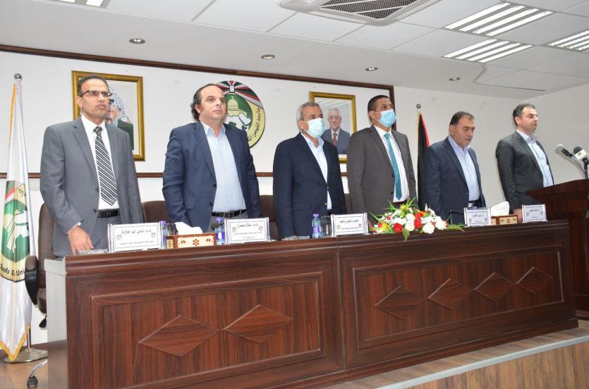 وبدأ المعرض بآيات من الذكر الحكيم، ثم السلام الوطني وقراءة الفاتحة على أرواح الشهداء، ومن ثم كلمة لمدير فرع الجامعة في قلقيلية د. نور الأقرع، الذي نقل خلالها تحيات السيد رئيس الجامعة أ. د. يونس عمرو راعي مسيرة هذه المؤسسة الوطنية من رفح جنوباً حتى جنين شمالاً، ومرحباً "بالحضور الكريم في صرح الجامعة التعليمي والمؤسسة الوطنية التي أشيد بتميزها وحكمة رئيسها وتكاملية مكوناتها وقدرتها على البقاء والتطور، وبتقدم خدماتها بكفاءة عالية في ظل كل الظروف التي تعصف بالساحة الفلسطينية السياسية والصحية".