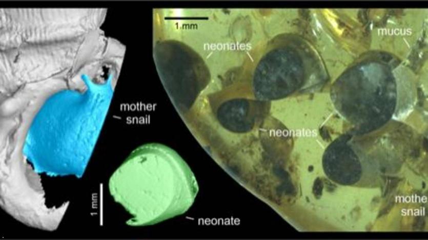 وتتابع: "في قطعة من العصر الطباشيري الكهرمان من ميانمار، اكتشفنا جسد وقشرة حلزون أرضي أنثوي محفوظ جيدًا بشكل استثنائي بعد وقت قصير من ولادة نسلها، والذي تم حفظه أيضًا في الكهرمان".