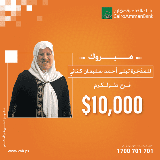 أعلن بنك القاهرة عمان، عن اسم الفائزة بالجائزة النقدية للأسبوع الرابع، ضمن حملة حسابات التوفير "ربحك قدام عيونك" بقيمة 10 آلاف دولار أمريكي لكل جائزة، وكانت الجائزة من نصيب السيدة ليلى احمد سليمان كتاني، المدخرة لدى فرع بنك القاهرة عمان في محافظة طولكرم.