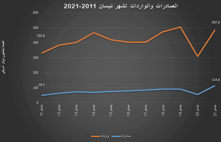 وبين التقرير أن الواردات خلال شهر نيسان الماضي انخفضت بنسبة 4% مقارنة مع الشهر السابق، بينما ارتفعت بنسبة 58% مقارنة مع شهر نيسان من عام 2020، حيث بلغت قيمتها 487.8 مليون دولار أمريكي.