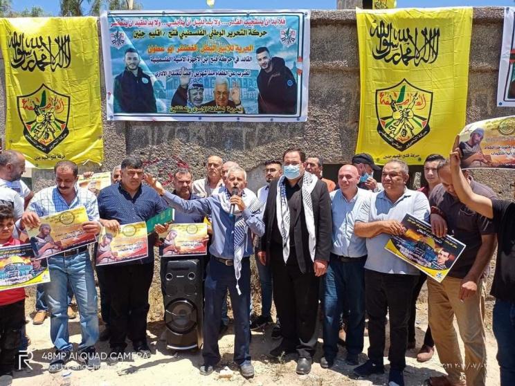 نظمت حركة فتح منطقة الشهيد عبد الله علاونة في جبع جنوب جنين وإقليم جنين، اليوم الجمعة، وقفة إسناد للأسير المضرب عن الطعام في سجون الاحتلال الإسرائيلي غضنفر أبو عطوان، في موقع "ترسلة"، بمشاركة عضو اللجنة المركزية لحركة فتح صبري صيدم، ورئيس هيئة مقاومة الجدار والاستيطان وليد عساف، وأمين سر فتح في جنين عطا أبو ارميلة، وأمين سر فتح في جبع رازي غنام، ومنسق فصائل العمل الوطني والإسلامي في محافظة جنين راغب أبو دياك.