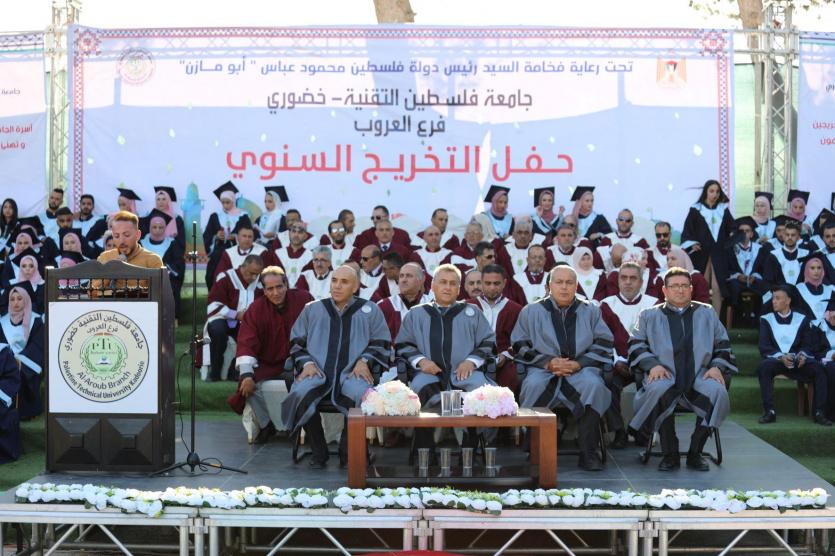 احتفلت جامعة فلسطين التقنية-خضوري، اليوم بتخريج الفوجين الثالث والرابع لفرع الجامعة في العروب، والفوجين الثالث عشر والرابع عشر من طلبة الجامعة تحت مسمى فوج "الثبات والتحدي"، الذي يأتي تعبيراً عن التمسك بالثوابت والصمود على الأرض، والمضي قدما في خوض التحديات، والثبات، والرباط، المتمحور على بناء الإنسان والشباب وتمكينهم باعتبارهم رأس المال الدائم الذي يجب تسليحه بالعلم والأمل والتحدي والمعرفة، حيث احتفلت الجامعة في فرعها بالعروب بتخريج 378 طالبة وطالبة من حملة درجة البكالوريوس من كلية الآداب والعلوم التربوية، وكلية الأعمال والاقتصاد، وكلية العلوم التطبيقية، وكلية مجتمع فلسطين التقنية- الدبلوم.