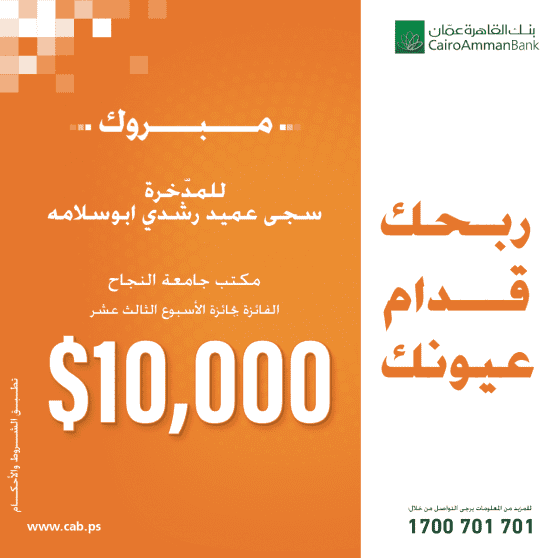 وفازت بالسحب الاسبوعي الثالث عشر، الطالبة سجى عميد رشيد ابو سلامة والمدخرة لدى مكتب بنك القاهرة عمان المتواجد بجامعة النجاح الوطنية بنابلس، كما أعلن البنك عن الفائزة بالأسبوع الثاني عشر، والتي كانت من نصيب السيدة مريم خليل احميدات، المدخرة لدى فرع واد التفاح في الخليل.