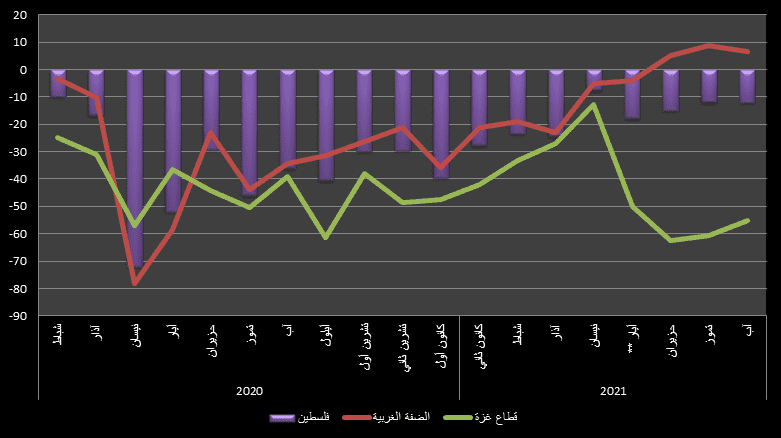 وأشارت نتائج التقرير، إلى استقرار المؤشر الكلي لفلسطين خلال شهر آب عند -11.9 مقارنة مع -11.8 في تموز، عطفًا على توجهاتٍ متباينة في شطري الوطن. ففي الضفة الغربية، تراجع المؤشر الكلي من حوالي 8.9 نقطة في تموز إلى 6.5 نقطة في آب، وذلك على خلفية انخفاض معظم المؤشرات الفرعية. إذ شهد مؤشر الزراعة تراجعًا ملموسًا (من 5.4 إلى 3.1)، كما تراجع مؤشر التجارة (من 2.2 إلى 0.7). في حين، استقرت باقي المؤشرات الفرعية بشكل نسبي عند 0.4 نقطة لمؤشر النقل والتخزين، و0.2 نقطة لمؤشر الاتصالات وتكنولوجيا المعلومات، و-0.2 نقطة لمؤشر الإنشاءات، وختاماً بمؤشر الطاقة المتجددة عند 0.0 نقطة. وفي المقابل كان مؤشر قطاع الصناعة الاستثناء الوحيد بارتفاعه من 0.9 إلى 2.1 نقطة.