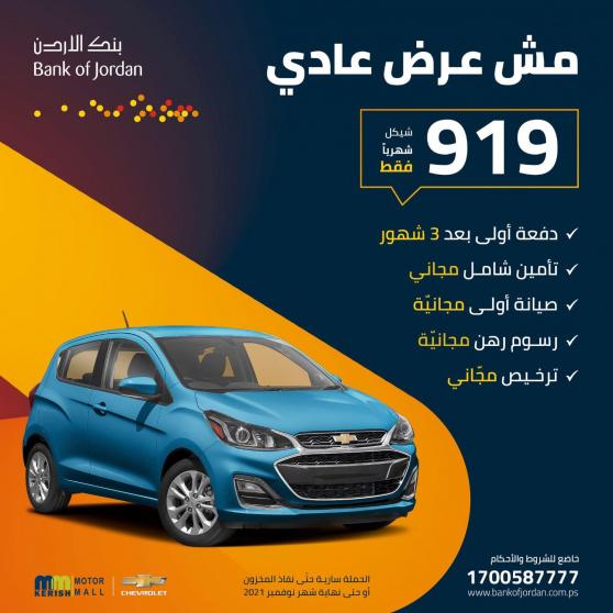 أطلق بنك الأردن حملة لتمويل شراء السيارات بالتعاون مع شركة قرش موتور مول، تحمل عنوان " مش عرض عادي " حيث تتضمن الحملة تقديم مزايا خاصة للموظفين من ذوي الدخل المتوسط من القطاعين العام والخاص المحولة راوتبهم سواء لدى بنك الأردن أو بنوك أخرى، للحصول على سيارة شفروليه سبارك بدفعة شهرية تبدأ من 919 شيقل.