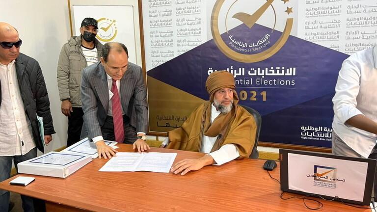 وقدم سيف الإسلام القذافي أوراق ترشحه للانتخابات في فرع المفوضية العليا للانتخابات بمدينة سبها الواقعة في جنوب غرب ليبيا.