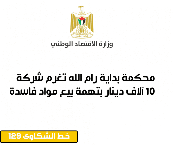 أفادت وزارة الاقتصاد الوطني بأن محكمة بداية رام الله ممثلة بهيئة القاضي بسام زيد، أصدرت حكماً بإدانة شركة (ك،أ) للمواد الغذائية، بالغرامة 10 آلاف دينار أردني، لعرض أو بيع او تداول سلع غذائية فاسدة او منتهية الصلاحية سنداً لأحكام المادة 1/2 من القرار بقانون رقم27 لسنة 2018 بشأن حماية المستهلك.