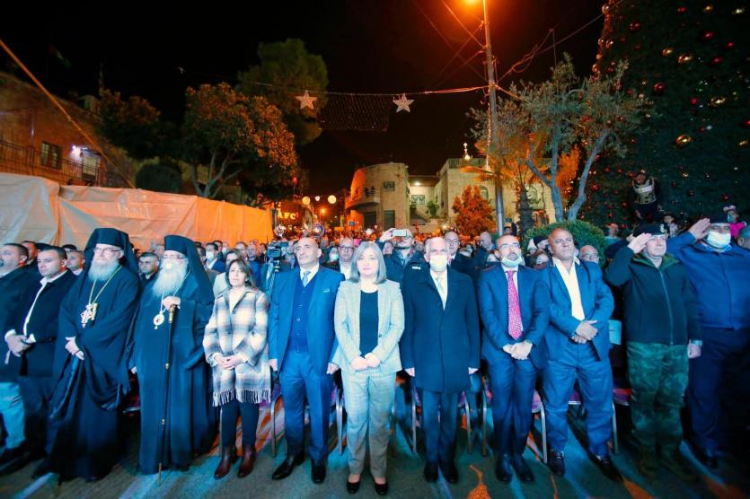 وحضر الحفل، محافظ بيت لحم كامل حميد، ووزيرة السياحة والآثار رولا معايعة، ممثلةً عن رئيس الوزراء محمد اشتية، ورئيس بلدية بيت جالا نيقولا خميس، ورئيس بلدية بيت ساحور جهاد خير، والوكيل البطريركي للروم الأرثوذكس في بيت لحم المطران فينذكتوس، ومدير عام اللجنة الرئاسية العليا لشؤون الكنائس أميرة حنانيا، وعدد من رجال الدين، وسفراء وقناصل معتمدين لدى دولة فلسطين، وقادة الأجهزة الأمنية.
