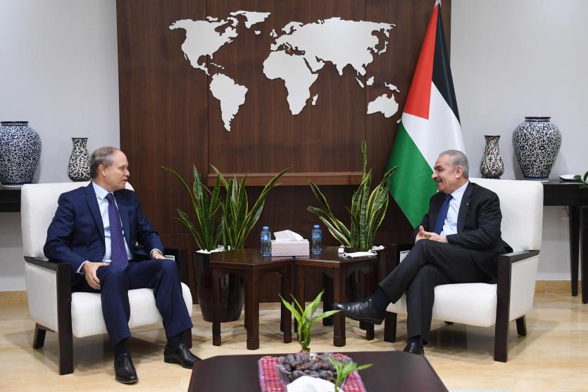بحث رئيس الوزراء محمد اشتية، في مكتبه بمدينة رام الله، اليوم الثلاثاء، مع القنصل الفرنسي العام في القدس رينيه تروكاز، آخر التطورات ومستجدات الأوضاع السياسية.