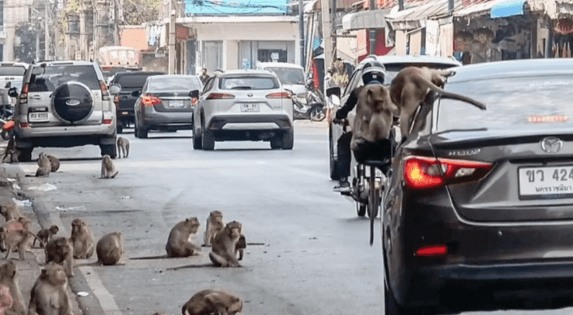 اجتاحت قطعان من القردة البرية بلدة تايلاندية قرب العاصمة بانكوك، إلى درجة أنها صارت تقفز فوق السيارات والبشر، بحثا عن الطعام، الذي تتقاتل للحصول عليه.