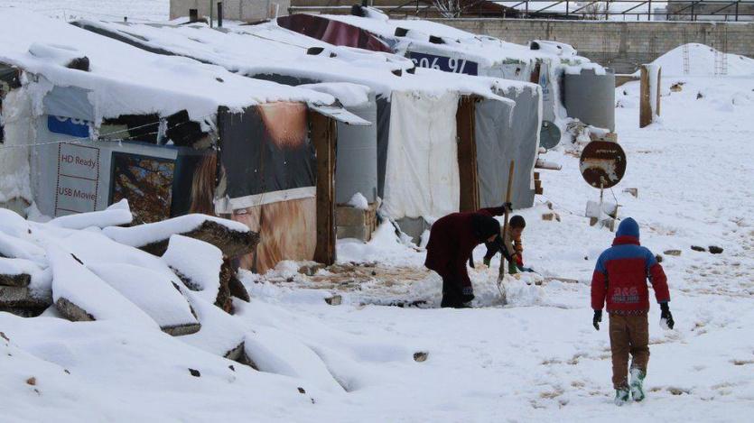 انهارت مئات الخيام في مخيمات النازحين بمناطق شمال سوريا جراء عاصفة ثلجية وأمطار غزيرة اجتاحت البلاد ليل الثلاثاء/ الأربعاء .