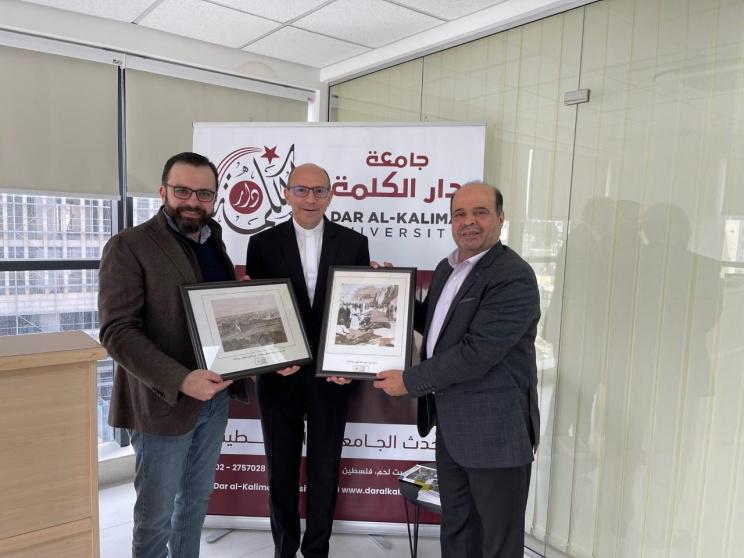وفي نهاية اللقاء قدم وكيل وزارة الاعلام الفلسطينية يوسف المحمود درع شكر وتقدير للقس البروفيسور متري الراهب، وهدية لجامعة دار الكلمة تمثلت في أول صورة فوتوغرافية لفلسطين وبالتحديد لمدينة القدس التقطت عام 1839، وصورة لمدينة بيت لحم ساحة المهد عام 1897.
