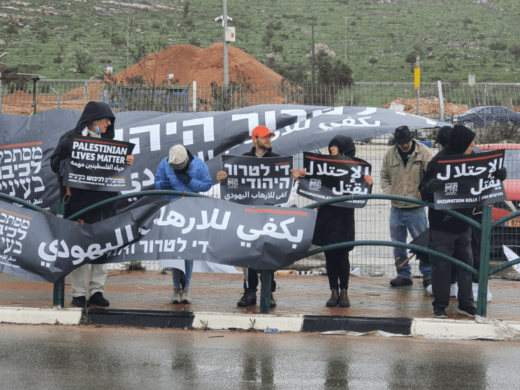 تظاهر نشطاء إسرائيليون ضمن حركة "ننظر للاحتلال بعيوننا"، اليوم الجمعة، قرب حاجز زعترة العسكري جنوب نابلس، ضد الاستيطان واعتداءات المستوطنين.