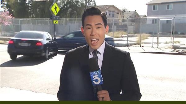 ويظهر المراسل، جين كانغ، من محطة "KTLA" الأمريكية وهو يغطي حادث اصطدام كر وفر وقع الشهر الماضي في تقاطع شارعين بجنوب لوس أنجلوس بالقرب من إنغلوود، والتي أشار إلى أنها "واحدة من أخطر الشوارع" في المدينة.
