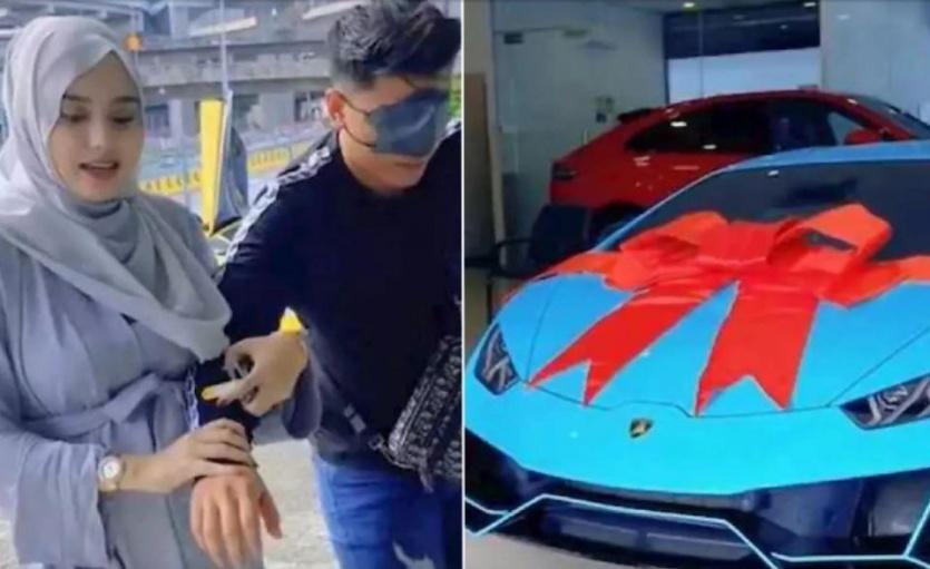وفاجأت المرأة زوجها في وكالة لبيع السيارات في كوالالمبور يوم الجمعة الماضي، حيث قدمت له سيارة لامبورغيني باللون الفيروزي، ووثقتها على تيك توك.