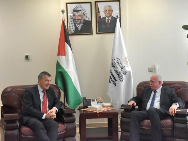 التقى وزير الخارجية والمغتربين رياض المالكي، اليوم الثلاثاء، المفوض العام لوكالة الأمم المتحدة لغوث وتشغيل اللاجئين الفلسطينيين في الشرق الأدنى (أونروا)، فيليب لازاريني، في مقر وزارة الخارجية والمغتربين بمدينة رام الله.