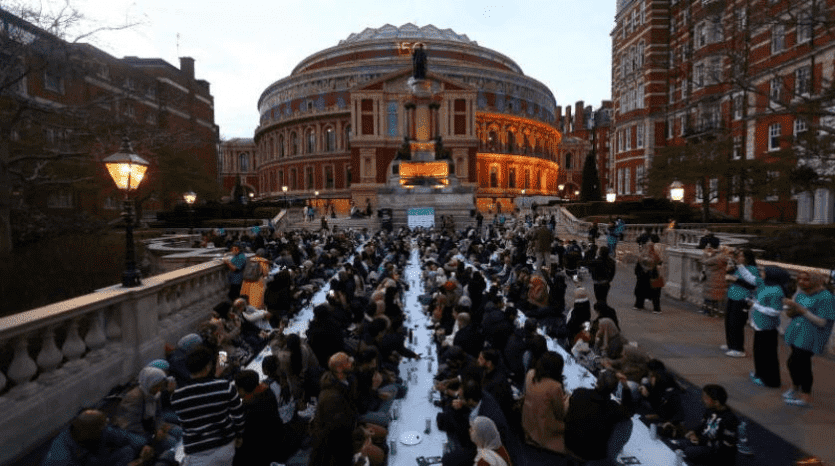 تحولت ساحة قاعة ألبرت الملكية في لندن، إلى منطقة لتناول الإفطار الرمضاني، وشهدت حضور 500 صائم في حدث ضخم.