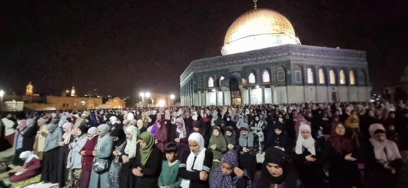 وقالت دائرة الأوقاف الإسلامية في مدينة القدس المحتلة، إن أكثر من 100 ألف مصل أدوا صلاتي العشاء والتراويح بالمسجد الأقصى رغم اجراءات الاحتلال المشددة، واقتحام قوات الاحتلال المسجد منذ ساعات الفجر.