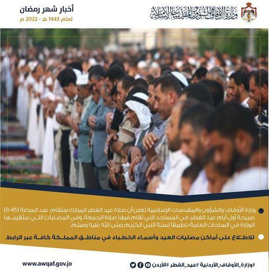أماكن ومتى موعد وقت صلاة عيد الفطر 2022 في الأردن، ننشرها لكم في سياق هذا المقال المقتضب وفق الإعلان الرسمي الصادر عن وزارة الأوقاف والشؤون والمقدسات الإسلامية الأردنية.