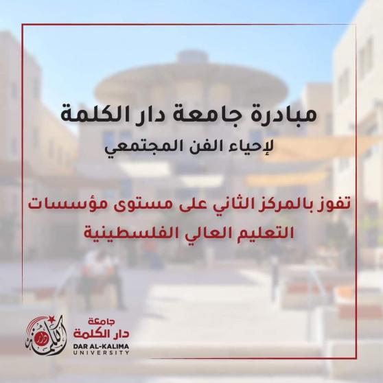 حصلت جامعة دار الكلمة في مدينة بيت لحم على جائزة المركز الثاني في مسابقة أفضل عمل تطوعي ضمن البرنامج الوطني للخدمة التطوعية للشباب، وذلك على مستوى مؤسسات التعليم العالي الفلسطينية.