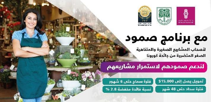 أطلق بنك فلسطين والصندوق الفلسطيني للتشغيل، وبتمويل من الصندوق العربي للإنماء الاقتصادي والاجتماعي مشروع " صمود 2” الذي يهدف إلى تمكين المنشآت الصغيرة ومتناهية الصغر التي تضررت بشكل مباشر وغير مباشر جراء تراجع أداء الاقتصاد الناجم عن حالة الظروف الصحية من انتشار الوباء العالمي كورونا (كوفيد-19)، وذلك من خلال تمكين هذه المنشآت من الوصول إلى السيولة المالية اللازمة لتغطية نفقاتهم التشغيلية الطارئة والانطلاق في اعمالها مجدداً.