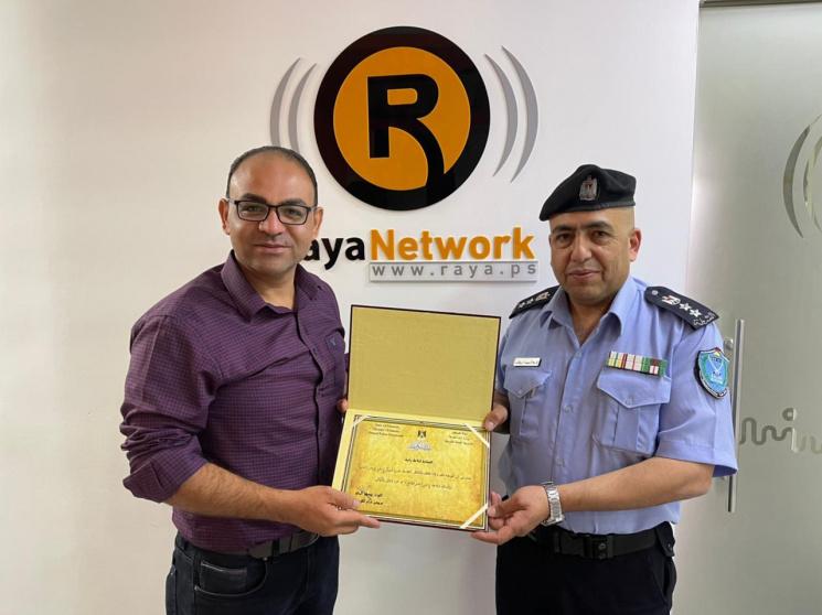 وسلّمت الشرطة الفلسطينية يمثلها العقيد لؤي ارزيقات الناطق باسم الشرطة، درع التكريم لشبكة راية الإعلامية يمثلها رئيس تحرير الشبكة الاستاذ شادي زماعره، وذلك بمقرها في مدينة البيرة.