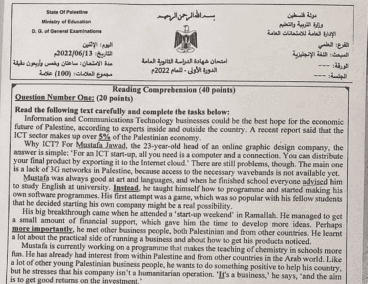 إجابات امتحان اللغة الإنجليزية الفرع العلمي للثانوية العامة 2022 توجيهي فلسطين الذي قدمه الطلبة اليوم الإثنين في المدارس بمختلف محافظات الوطن، وسط حالة من الارتياح في صفوف الطلاب.