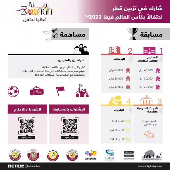 أعلنت لجنة الإشراف على تجميل الطرق والأماكن العامة بالدولة، عن إطلاق مبادرة "زِينة" تحت شعار "تعالوا نحتفل" بهدف تجميل وتزيين واجهات أماكن العمل والمدارس والجامعات والعقارات بالإضافة إلى الساحات والطرق وغيرها من الخدمات العامة؛ بمناسبة قرب موعد استضافة قطر لمونديال كأس العالم 2022، بالتعاون مع اللجنة العليا للمشاريع والإرث، ووزارة البلدية، ووزارة التربية والتعليم والتعليم العالي، ووزارة الثقافة، ومتاحف قطر، والمجلس البلدي المركزي، وذلك خلال مؤتمر صحفي عقد اليوم الأربعاء الموافق 22يونيو الجاري بمقر هيئة الأشغال العامة "أشغال".