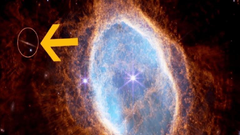 ولكن هناك تفاصيل مهمة للغاية فقدناها للوهلة الأولى، تقع خلسة في الجزء العلوي الأيسر من صور سديم الحلقة الجنوبية في ما يبدو وكأنه خط من الضوء - ولكنه في الواقع منظر جانبي لمجرة.