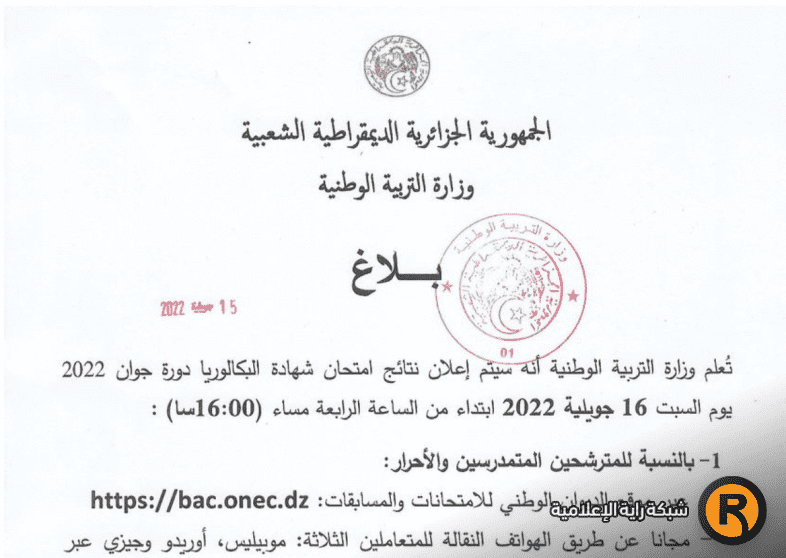 نتائج البكالوريا في الجزائر 2022 إذ أشادت الوزارة أيضا بالدوائر الوزارية والأسلاك الأمنية وجميع المساهمين بشكل مباشر أو غيره في نجاح هذه الدورة الامتحانية، موجهة الشكر إلى مؤسسة الاتصالات الرسمية ومتعاملي الهاتف النقال الثلاثة بلا استثناء.