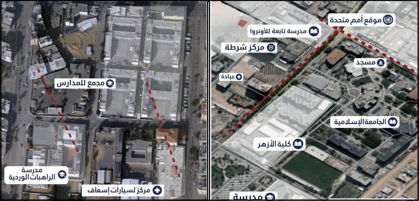 ومن بين المواقع التي ادعت إسرائيل، أن حركة حماس تستخدمها لعملها العسكري موقع لتصنيع الأسلحة بالقرب من مستشفى الشفاء، ومستودع أسلحة بالقرب من مسجد الشهيد في مخيم البريج، ومسار نفق في محيط مصنع بيبسي، بالاضافة الى مسارات لنفق بالقرب من مجمع مدارس يضم مدرسة راهبات الوردية ومدرسة الوحدة ومدرسة أم القرى الأساسية المشتركة، كما يكشف عن فتحة نفق بالقرب من الجامعة الاسلامية، حسب ما يدعي الأمن الإسرائيلي.