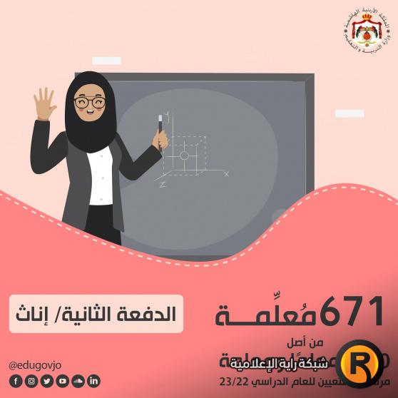 وقالت الوزارة: "تهانينا للمرشحات للتعيين،.. الدفعة الثانية من تعيينات وزارة التربية والتعليم دفعة الإناث الأولى، (671) معلمة من مختلف التخصُّصات، من أصل (4000) معلمًا ومعلّمة سيتم تعيينهم للعام الدراسي 23/22".