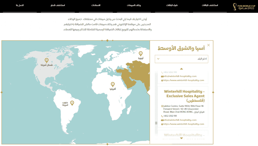ويتضمن الموقع عناوين لوكلاء المبيعات في عدد من دول المنطقة، الذين تعاقد معهم الاتحاد الدولي لكرة القدم "الفيفا" لتسويق وبيع حزم الضيافة وتذاكر المباريات.