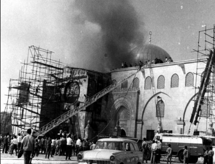 وكان حريق ضخم شب في الجناح الشرقي من المصلى القبلي في الجهة الجنوبية للمسجد الأقصى، والتهمت النيران كامل محتويات تلك المنطقة بما في ذلك منبر صلاح الدين التاريخي، وكان أن يصل الحريق إلى قبة الصخرة.