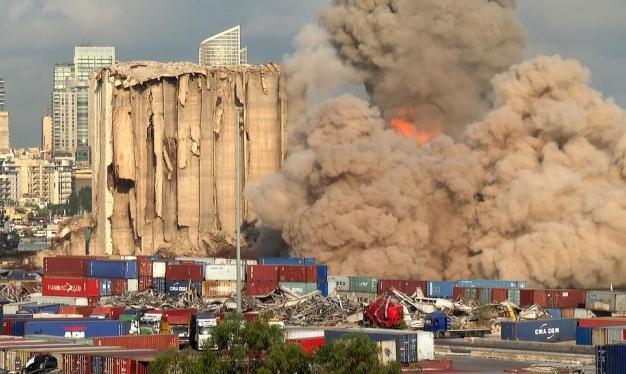 انهار صباح اليوم، الثلاثاء، الأنقاض المتبقية من الكتلة الشمالية للصوامع المشتعلة في مرفأ بيروت متسببة في تصاعد سحابة كثيفة من الغبار. وكانت صوامع الحبوب قد تضرّرت من جراء الانفجار المدمر الذي وقع في المرفأ قبل سنتين.