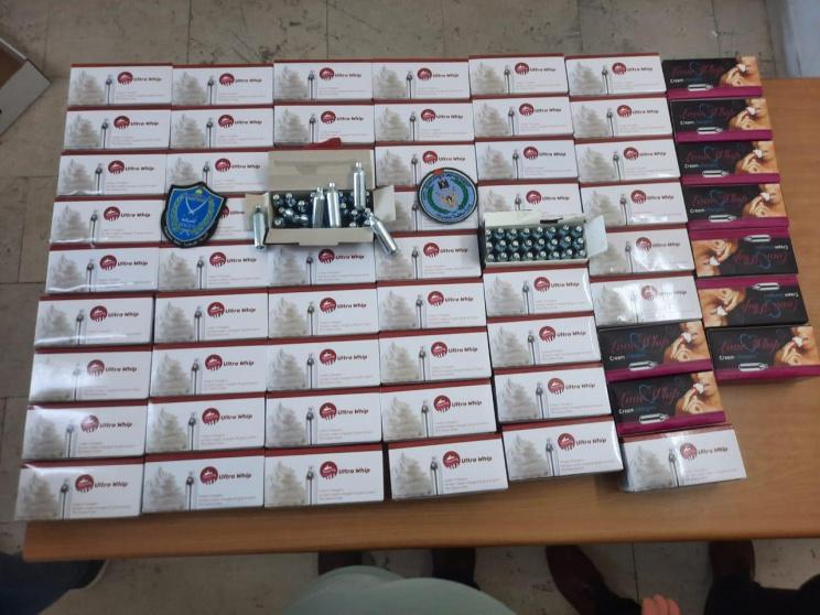 وذكر العقيد لؤي ارزيقات الناطق الإعلامي باسم الشرطة أن قوة من فرع مكافحة المخدرات في شرطة المحافظة يرافقها ضباط من جهاز الضابطة الجمركية ضبطت 1464 عبوة من غاز أكسيد النيتروز " الضحك" بحجم 8 غم خلال جولة على المحال التجارية التي تبيع هذه المواد وتم مصادرة هذه الكميات لعدم حيازة من يقومون بالإتجار بها على الوثائق والفواتيرالرسمية الخاصة بها.