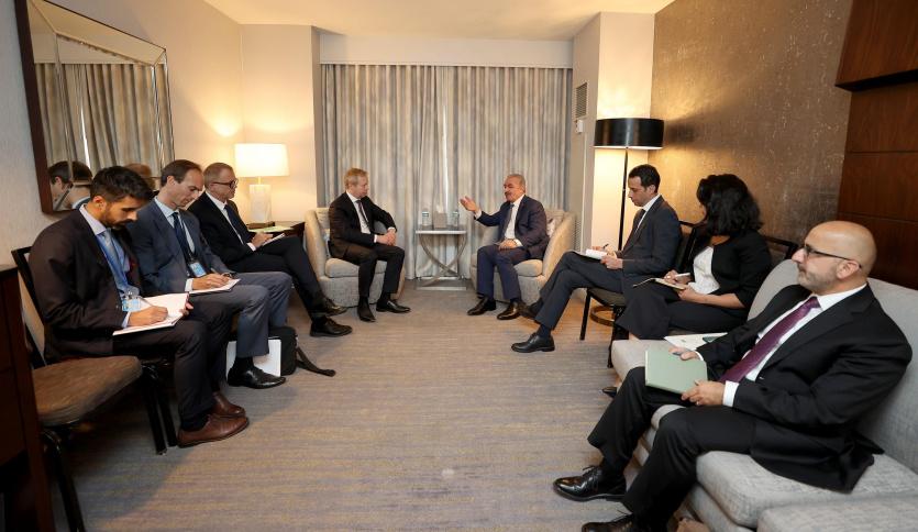 التقى رئيس الوزراء محمد اشتية، اليوم الخميس، نائب مساعد وزير الخارجية الأمريكي للشؤون الفلسطينية الإسرائيلية هادي عمرو، والمبعوث الأوروبي الخاص لعملية السلام في الشرق الأوسط سفين كوبمانز، بالإضافة إلى مدير إدارة الشرق الأوسط وشمال أفريقيا بوزارة الخارجية الألمانية توبياس تونكل، كلا على حدة، وذلك على هامش انعقاد اجتماع المانحين في مقر الأمم المتحدة في نيويورك.