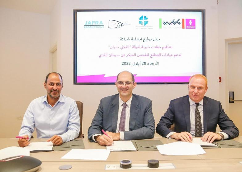 وقع بنك فلسطين بالشراكة مع مستشفى الأوغستا فيكتوريا "المطلع" وشركة جفرا للإنتاج الفني، اتفاقية لدعم عيادات مستشفى المطلع للفحص المبكر عن سرطان الثدي في فلسطين من خلال تنظيم حفلات خيرية لفرقة "الثلاثي جبران"، للمساهمة في رفع الوعي حول اهمية الكشف المبكر عن سرطان الثدي والوصول الى السيدات في مختلف المناطق في فلسطين لحثهم على عمل الفحوصات.