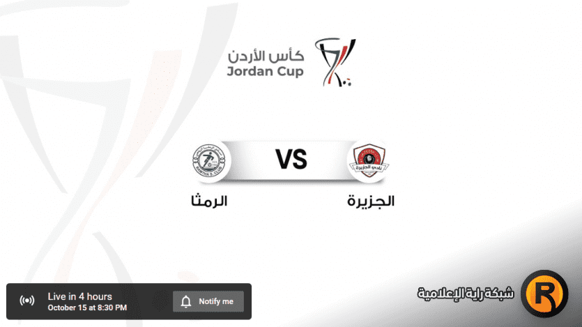 مباراة الجزيرة ضد الرمثا تنقل على شبكة راية الإعلامية نقلا عن قناة الأردن الرياضية ومنصات الاتحاد الأردني لكرة القدم عبر فيسبوك ويوتيوب وكذلك التردد الرسمي للأردنية سبورت على القمر الصناعي نايل سات