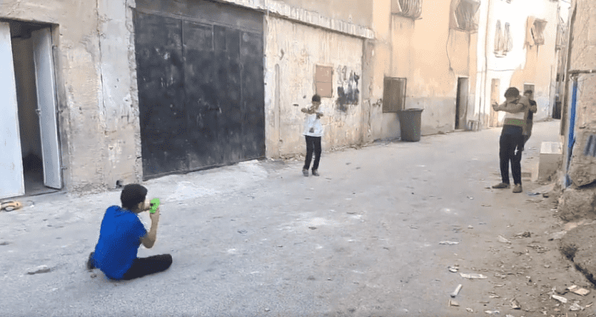 من المفارقات أن الأطفال دائما وفي كل مكان تستهويهم لعبة الحرب، حيث يطلقون النار من بنادقهم ومسدساتهم الخشبية، إلا أن أطفالا بمخيم العروب بالخليل أعادوا محاكاة اشتباك حقيقي.