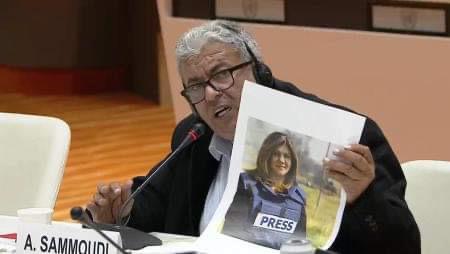 مراسل صحيفة "القدس" والمنتج في قناة "الجزيرة ، توجه الى جنيف بناء على دعوة رسمية لتقديم شهادته امام لجنة التحقيق بشان الاراضي الفلسطينية المحتلة التابعة لمجلس حقوق في الامم المتحدة والتي عقدت عدة جلسات استماع في للتحقيق في انتهاكات اسرائيلية للقانون الانساني الدولي في الاراضي المحتلة والقدس، وبعد شهادات نقيب الصحفين ناصر أبوبكر ورئيس لجنة الحريات محمد اللحام ولينا أبو عاقلة ، دخل قاعة المؤتمر وهو يحمل صور زميلته في قناة الجزيرة شيرين ، وافتتح شهادته برفع صورتها، قائلا " سأرفع صورة الشهيدة شيرين ، التي مر ٦ شهور على جريمة قتلها برصاص جندي اسرائيلي ، ما زال حراُ طليقاً، بينما نبكي ونتألم على فقدانها ، وجرحي ما زال ينزف من رصاصهم ، وتأثير الجريمة مستمر على كل رفاقي، لذلك ، اطالبكم بالعدالة بمحاكمة القتلة.