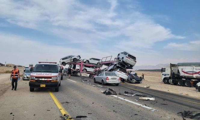 لقي رجل وامرأة مصرعيهما، بعد ظهر اليوم الإثنين، في حادث طرق وقع بين شاحنة لنقل المركبات وسيارتين خصوصيتين على شارع 90 في منطقة النقب، جنوبي البلاد.