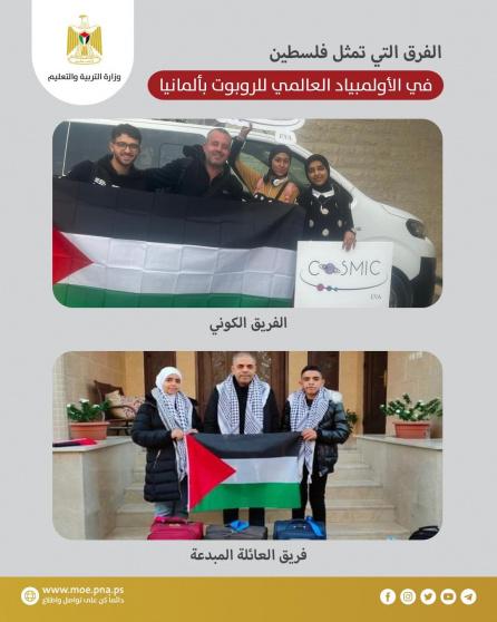 ويمثل فلسطين في هذه المنافسة الدولية كلا الفريقين الفائزين في المنافسة المحلية وهما: فئة (مهندسو المستقبل) من فريق مديرية قباطية، وهم الطلبة؛ ندى محمد سليمان البزور من مدرسة بنات رابا الثانوية و أرتاج عبدالله عادل حمد من مدرسة بنات جبع الثانوية و محمود بلال محمود نزال من مدرسة الشهيد عزت أبو الرب الثانوية للبنين من المحافظات الشمالية/ مديرية قباطية، تحت إشراف م. جهاد خلوف، وعن فئة (مبدعو المستقبل) من المحافظات الجنوبية/ مديرية غرب خان يونس عن مشروع: " روبوت الحديقة المنزلية الذكية" للطالبين ملك سعيد أبو الروس وإبراهيم سعيد أبو الروس؛ بإشراف م. سعيد أبو الروس، من مديرية غرب خان يونس، ويرافق الوفد من وزارة التربية منسقة المسابقة من الإدارة العامة للمصادر والتقنيات هناء عمران.