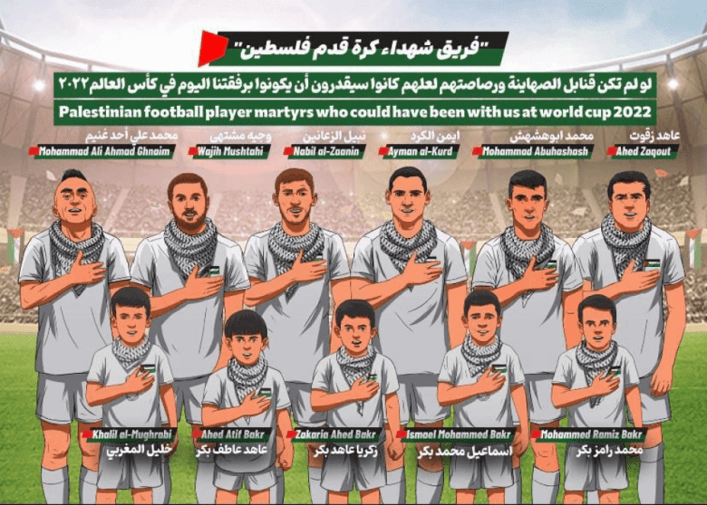 وتصدر الصورة عنوان كبير "لولا قنابل الصهاينة ورصاصاتهم لاستطاعوا أن يكونوا برفقتنا اليوم في كأس العالم 2022"، في إشارة إلى إجرام العدوان الذي تسبب في إزهاق أرواحهم.