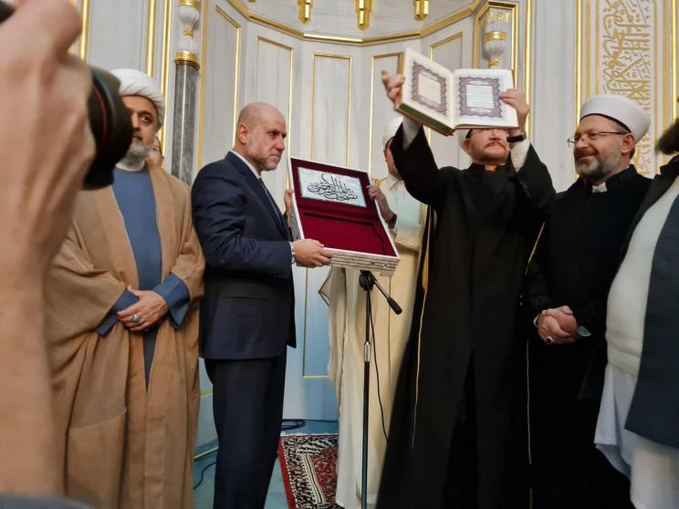 باسم الرئيس محمود عباس، سلّم قاضي قضاة فلسطين، مستشار الرئيس للشؤون الدينية والعلاقات الإسلامية محمود الهباش، اليوم الجمعة، الشيخ راوي عين الدين رئيس الإدارة الدينية لجمهورية روسيا الاتحادية رئيس مجلس المفتين لروسيا، نسخة مطبوعة من مصحف المسجد الأقصى المبارك، خلال صلاة الجمعة في مسجد موسكو بالعاصمة الروسية.