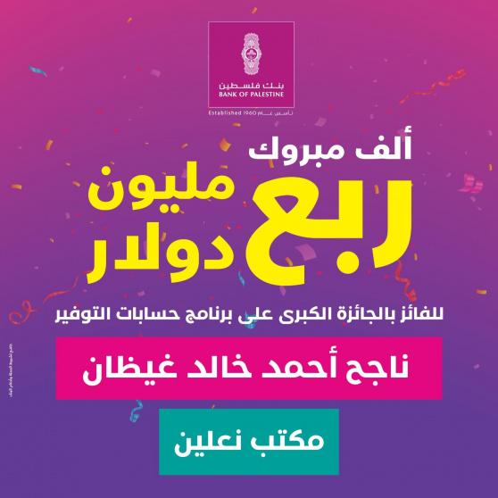 بنك فلسطين يعلن الفائز بالجائزة الكبرى التي تبلغ قيمتها ربع مليون دولار لحسابات التوفير الشهرية
