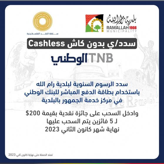 في إطار حملة سلطة النقد الفلسطينية لتشجيع الدفع الإلكتروني وبالتعاون مع بلدية رام الله، أطلق البنك الوطني حملة جديدة لعملائه لتشجيعهم على تسديد الرسوم السنوية للبلدية الكترونيا عن طريق الدفع من خلال بطاقات الخصم المباشر (بطاقة الصراف الآلي) عبر أجهزة نقاط البيع الموجودة في مقر البلدية. ومن خلال الحملة، يجري السحب على أسماء 5 فائزين من العملاء الذين استخدموا بطاقاتهم لتسديد رسوم البلدية، لربح 5 جوائز نقدية بقيمة 200 دولار لكل فائز.